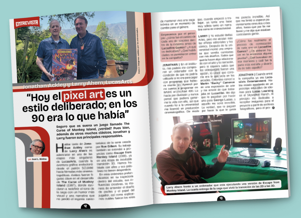 En la entrevista de este número 14 de PIXELS tenemos a una pareja que os va a sacar más de una sonrisa. Se trata de Jonathan Ackley y Larry Ahern, los dos máximos responsables de The Curse of Monkey Island. Aunque a lo largo de todas las páginas del artículo vais a conocer en qué otros proyectos legendarios pusieron parte de su talento. Canela fina… aunque lo digamos nosotros.